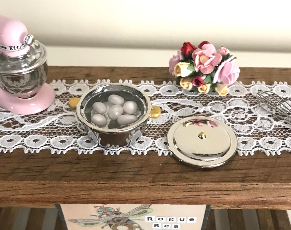 Mini Dollhouse 1:12 Scale Silver Metal Pot of Boiling Eggs, Cooking, Easter